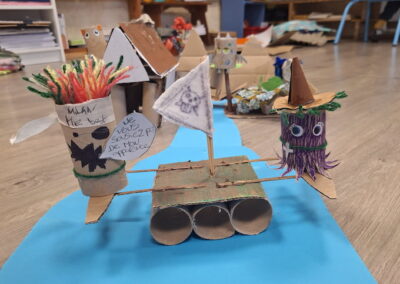 En arts plastiques, les élémentaires ont créé des personnages à partir de matériaux de récupération avant de réaliser des décors collectifs. Les maternelles ont confectionné des arbres en mêlant collage (travail du graphisme) et peinture au doigt (exploration des couleurs primaires et secondaires).