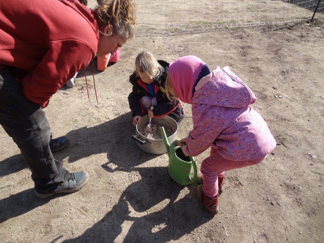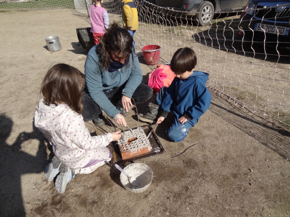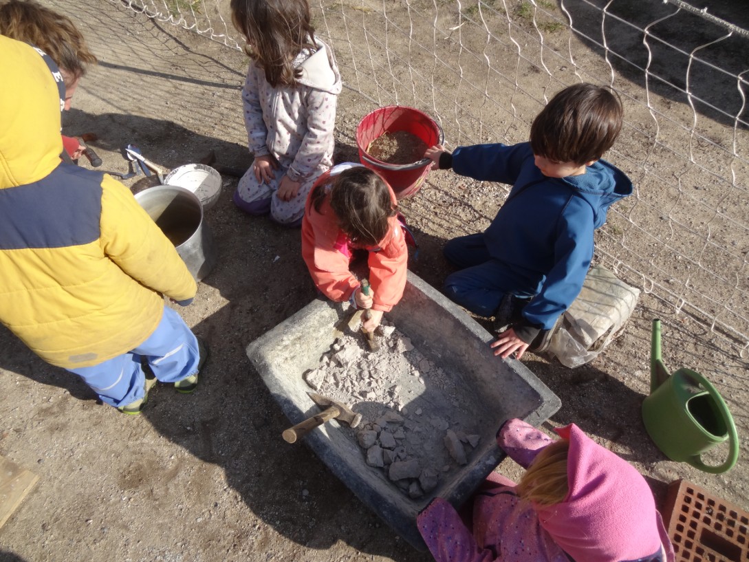 Tout le monde a trouvé de quoi faire, taper au marteau, ajouter le sable, l’eau, mélanger, remplir les trous…Bravo les enfants, on a bien travaillé !